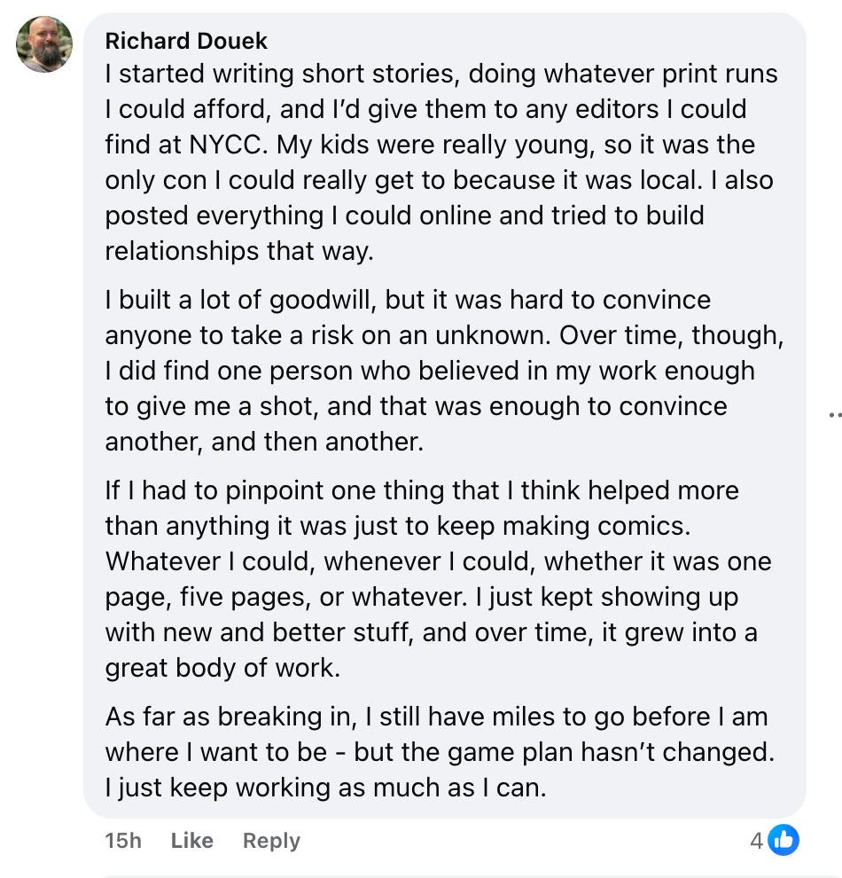 The second thing I saw, coincidentally on Facebook as well, was what I can only call a wave of struggling creators complaining about their place in the industry, putting out calls “to the universe” about what publishers they’d like to work for, etc.